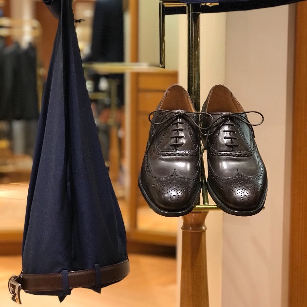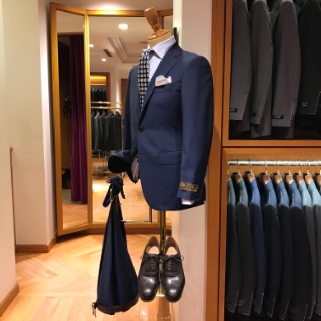 イタリア生地のネイビースーツにシューズとベルトもイタリアンな雰囲気でブラウンカーフを合わせました。青と茶の王道のコンビーネーションですね。