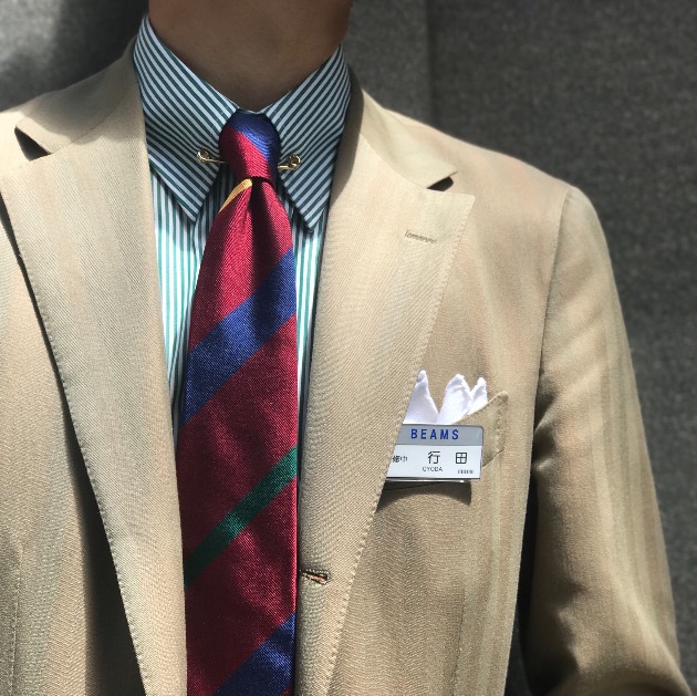 行田のような緑のストライプシャツと赤のストライプタイは馴染みの良い色だと思われます。ゴールドのカラーピンもオススメです。