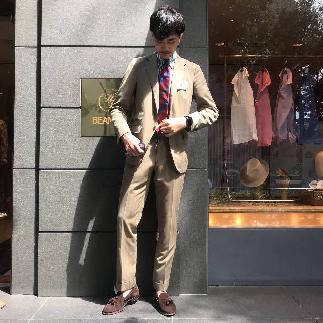 183cmと身長があるため、同じスーツでも私が着るのとは全く違った見え方になります。やはり晴れた空の下が一番似合いますね。