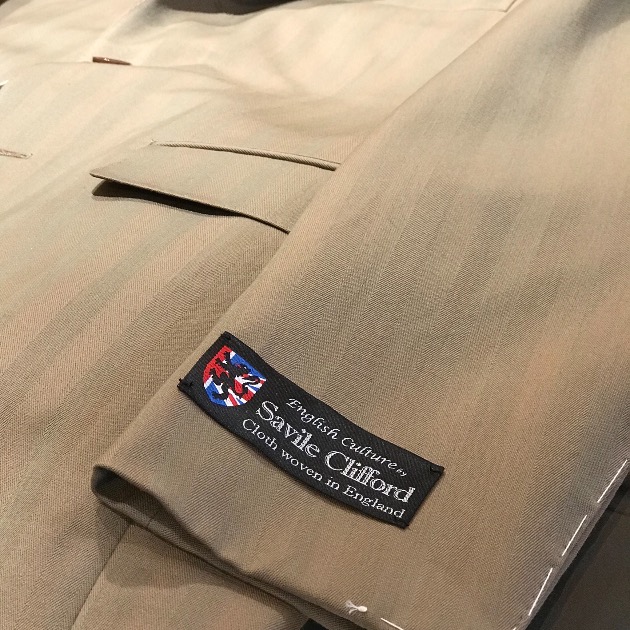 <SAVILE CLLIFORD>のウール50コットン50のソラーロ生地、赤っぽくも緑っぽくも見えて非常に良い雰囲気です。
