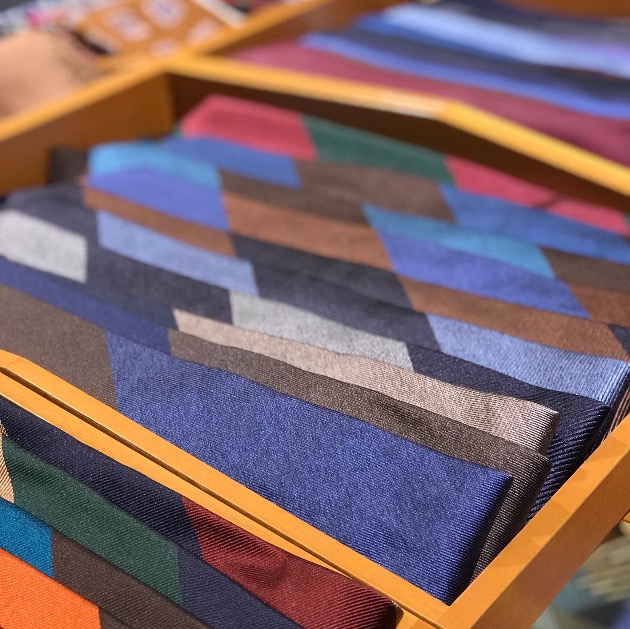 レジメンタルストライプや、ブロックストライプ。第一便からいい柄が揃ってます。欲しい時には売り切れているという事がネクタイでは良くあるかと思います。ネッカチーフもネクタイもピンと来たらお早めにどうぞ。