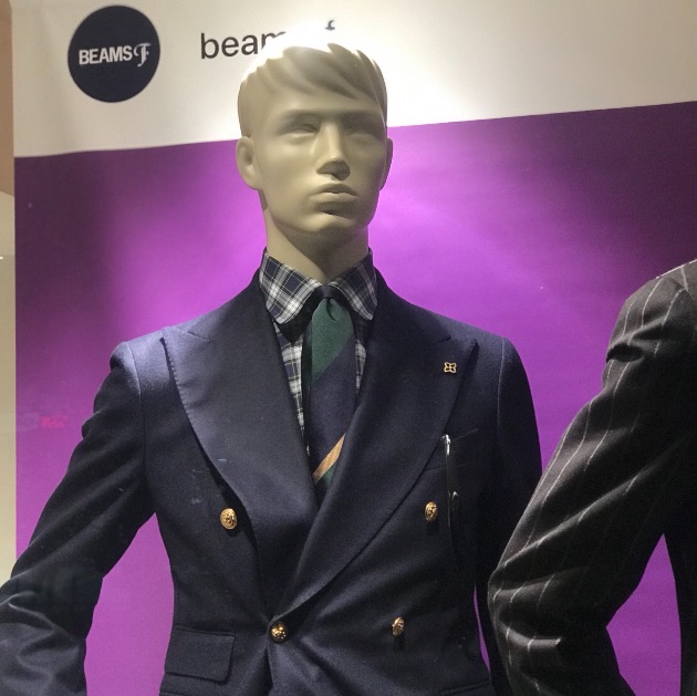 左は<TAGLIATORE>のダブルのブレザーです。男らしい堂々としたラペルが特徴で、Vゾーンはグリーンを基調としております。軽快に白のコットンパンツにコインローファーでコーディネート。