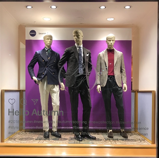 昨晩メインディスプレイの変更を行いました。<HELLO AUTUMN>は変わらず、マネキンが着替えただけですので、コーディネートの紹介を致します。