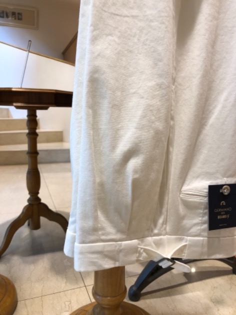 合わせたボトムスは<GERMANO>の2プリーツでサイドアジャスターのパンツ。素材はコットンですが、これからの季節にうってつけの軽さです。