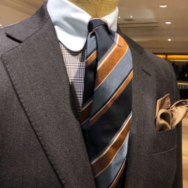 シャツはブラウンのグレンプレイドのクレリックシャツ。タイはホワイト〜グレー〜ブラックにオレンジが差されたストライプ。