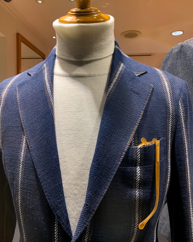 コットン/リネン/ウールの柔らかなタッチが心地よい、ワイドピッチのクラブストライプ。
