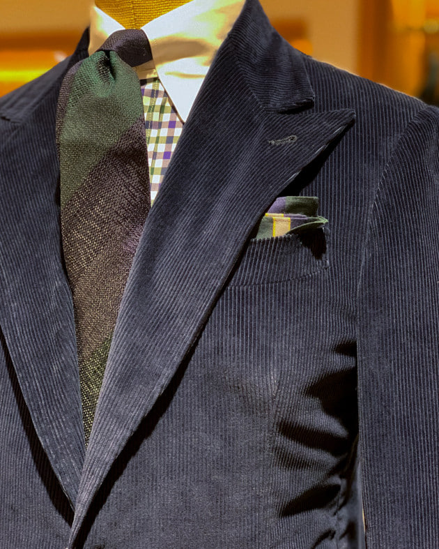 ピークトラペルの中畝コーデュロイジャケットに、ギンガムのタブカラーと二段ストライプ。