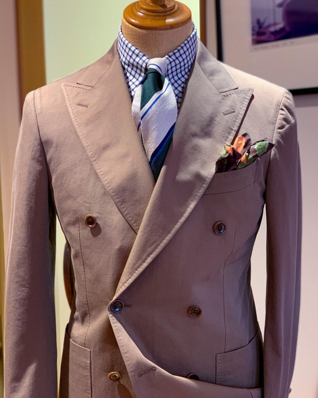 パッチポケットのコットンスーツですから、ドレッシーなコーディネートは避けるのが無難。