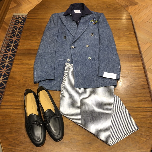 リネンのシャツに発色の良いチーフを差して、プリントTにさらっと羽織っても良さそうです。