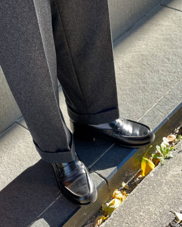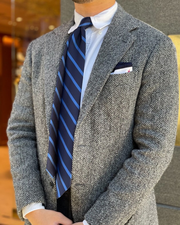ボタンダウンにレジメンタルタイで、清潔感あるコーディネート。