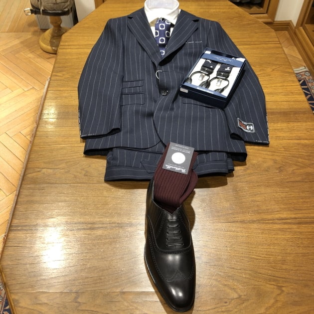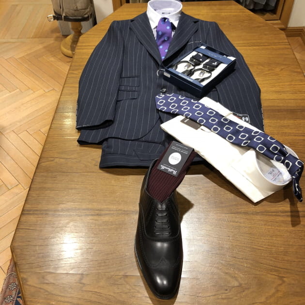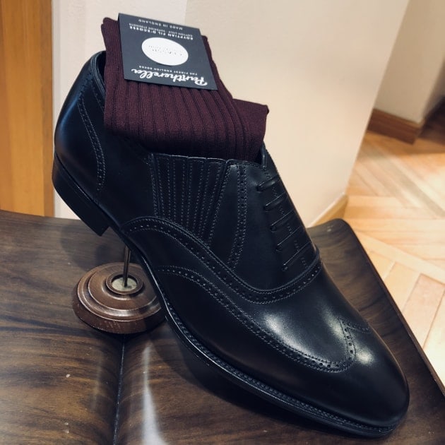 ブラックカーフ×ボルドーのソックスを選んだコーディネートは英国気質を感じる装い。