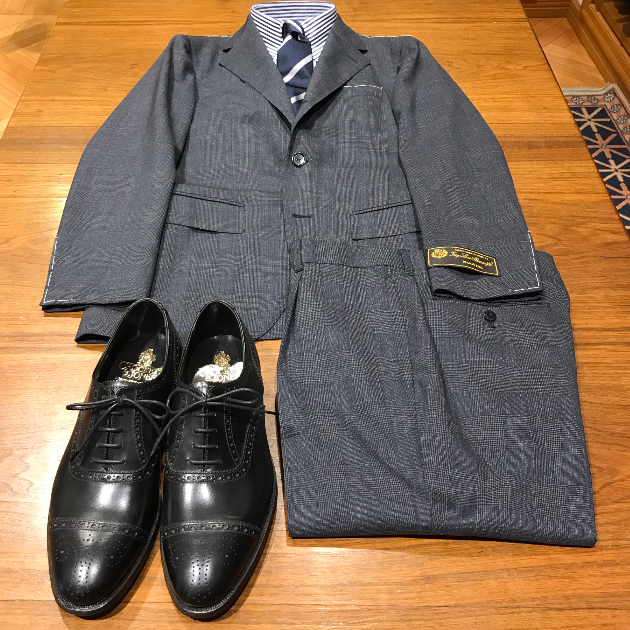やはりクラシックなグレンプレイドのスーツはタブカラーやストライプ、ブローグシューズといったアイテムと相性が良いですね。