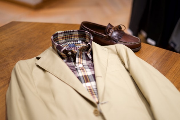 雨の日以外にもベージュのコットンスーツを合わせたアメリカンなスタイルにも