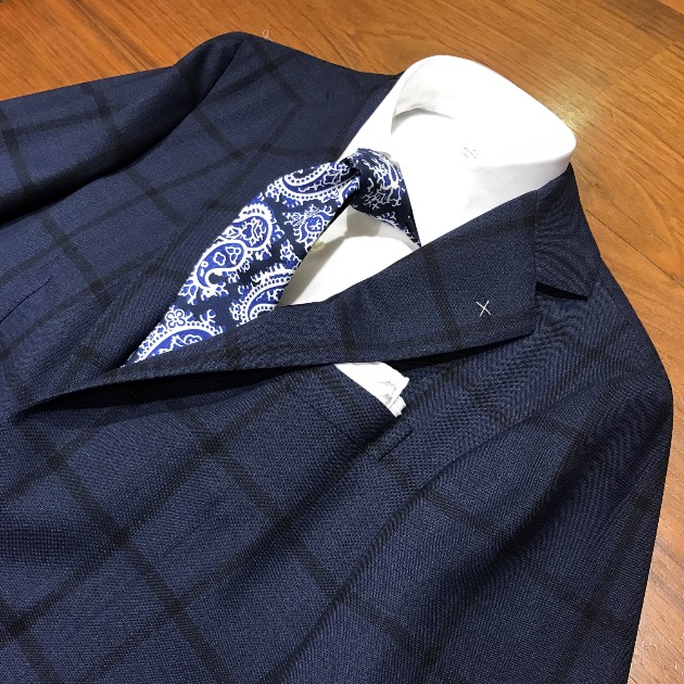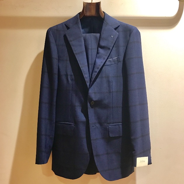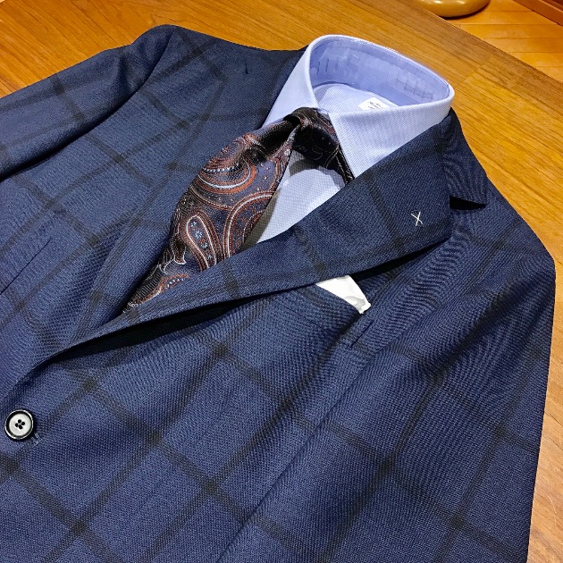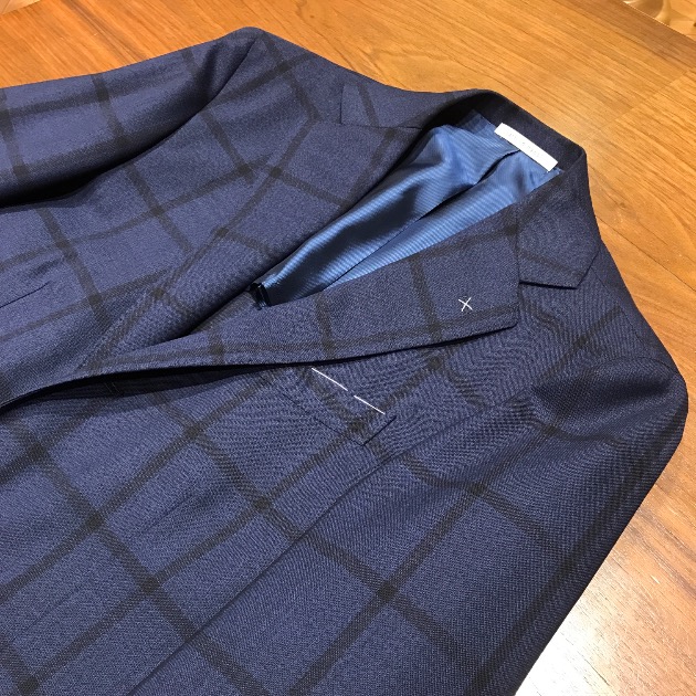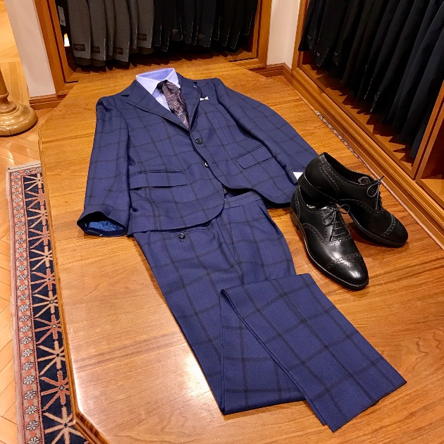 明るいネイビーベースの生地にウィンドウペーンが入ったチェックスーツです。