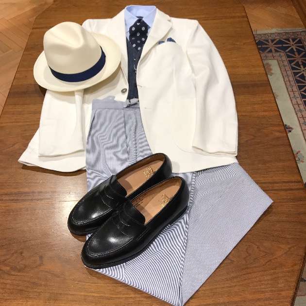 清涼感のあるシアサッカーのパンツにボルサリーノを被り2枚目にスタイリング致しました。