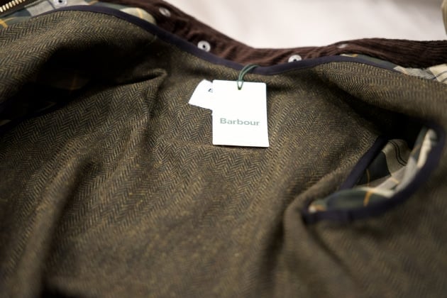 バブアーと言えば、のオリーブのオイルド生地にブラウンの太畝コーデュロイ襟。