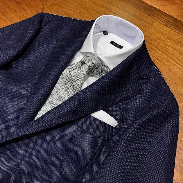 明るい無地のネイビージャケットとスエードローファーを合わせました。
