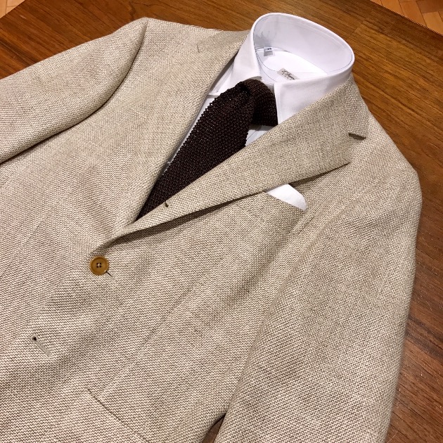 こちらは、無地のベージュのジャケットにスエードローファーを合わせました。