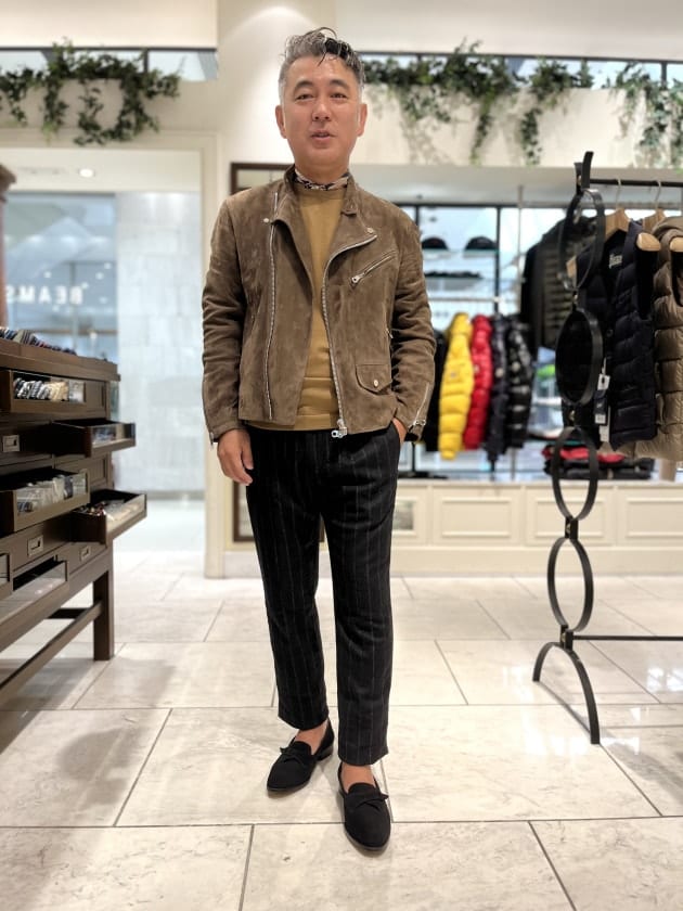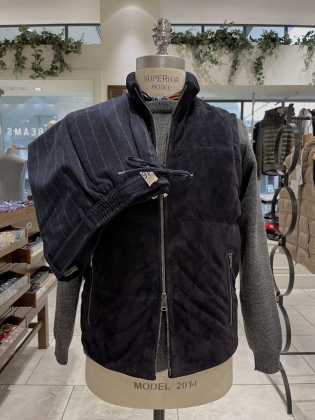 スエードのダウンベストで大人スポーティーにしつつもパンツはウールで上品に!