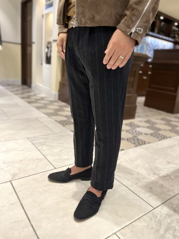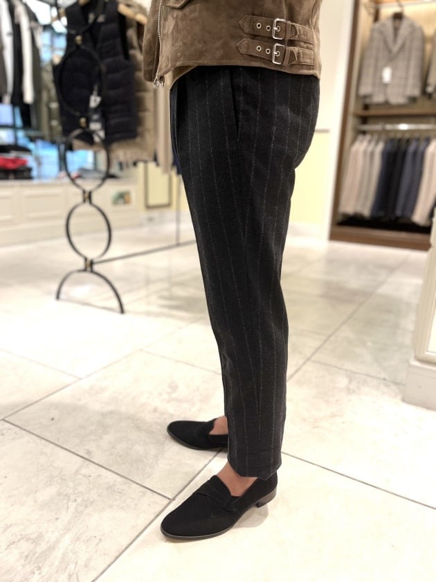 ここ最近では、ストライプのパンツはだいぶ馴染みが出始めて定番となり人気の柄となっていますね!今回ビビットきたのがこの2.5cmのワイドストライプ!それも地色に馴染ませる様な、暈すようなチョークストライプ!堪りません!シンプルな合わせでも、このワイドストライプがより大人感を醸し出しカッコイイ艶な男になっちゃいます!実にイイ‼︎