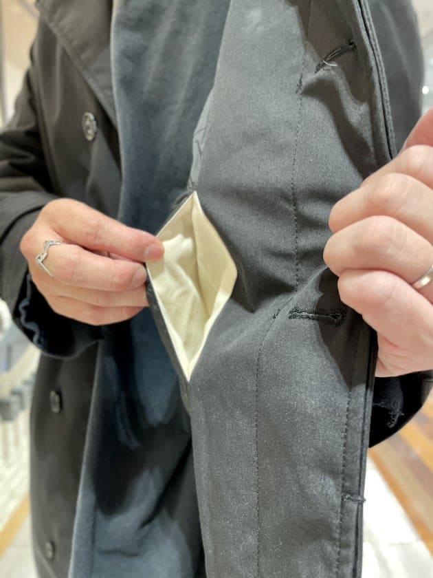 防風性を高める為、襟を立てて着ることを目的としたボタンで止めることが出来ます。また、襟を立てるとさりげなくブランドロゴが見えるのも嬉しいポイントです。