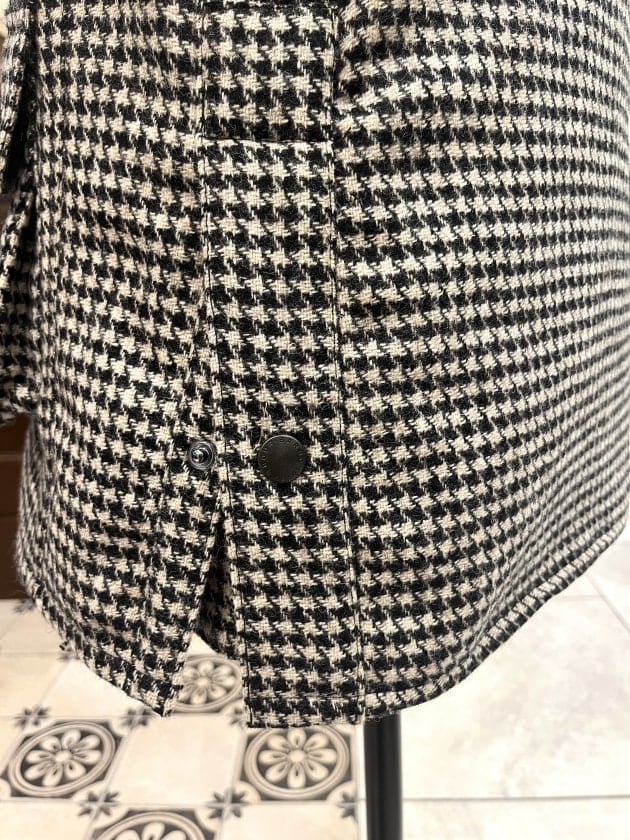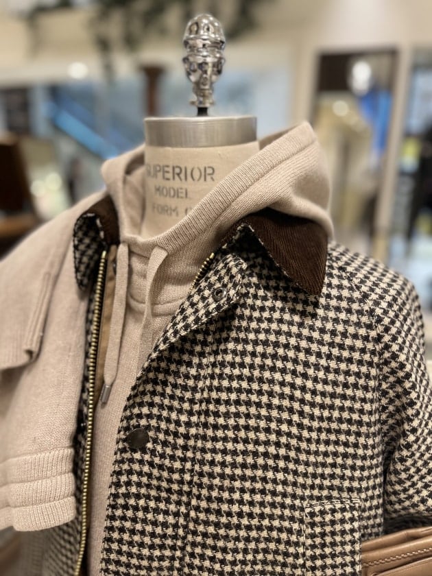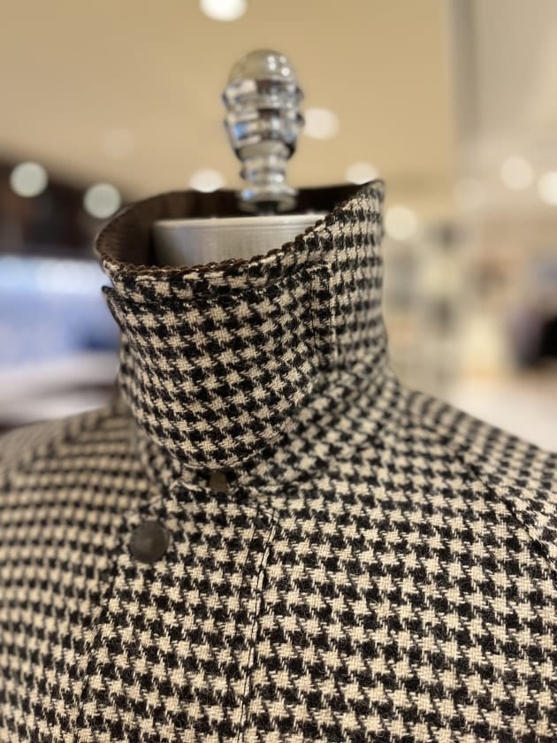 今回の生地は150年以上の歴史を誇る伝統的なウールツィードメーカー〈Mallalieus〉社製のハウンドトゥース柄を使用した別注ジャケット。色合いは、ベースにベージュ×ブラック!柄の大きさ、そして色味のマッチとコントラストは洋服好きには堪りませんね。質感はラムウールの原料を使用することで、英国ウール特有の硬さを緩和したソフトな風合いでしっかりと英国の良さとモダンさも感じられます!モデルはクラシックビデールをベースに着丈を長くし、胸脇のハンドウォーマーと腰のポケットも変更した別注モデル!着丈の長さがまた、スーツスタイルにも相性は抜群に良し◎もちろんカジュアルにも◎この男臭さがあるFの別注は好きですね!
