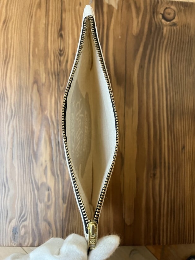 3つ目は、何かと使えそうなジッパーポーチ。生成りの生地にシルクスクリーンプリントのロゴの組み合わせが抜群。