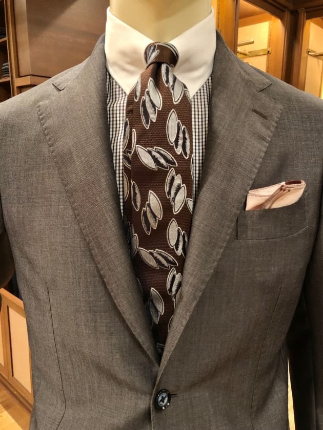 各アイテムをブラウン系のトーンでまとめつつ、スーツのグレイッシュな色合いをネクタイの柄で色を拾って