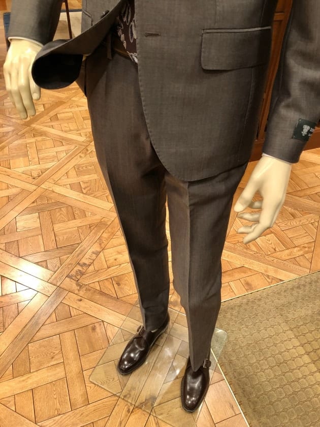 コントラストが付き過ぎない濃いめのブラウンにモヘヤスーツの清涼感と英国的なジャカードネクタイに合わせてカーフのシングルモンクストラップシューズを履かせております。