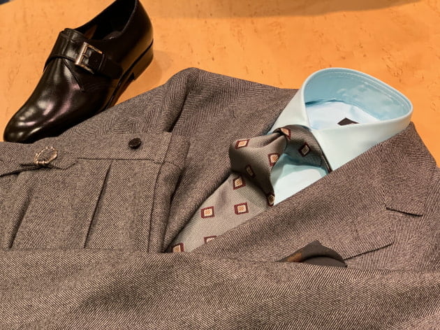 タイの色がグレイッシュで、ただグレースーツと合わせると同化してしまうのでシャツは明るめのトーンに。