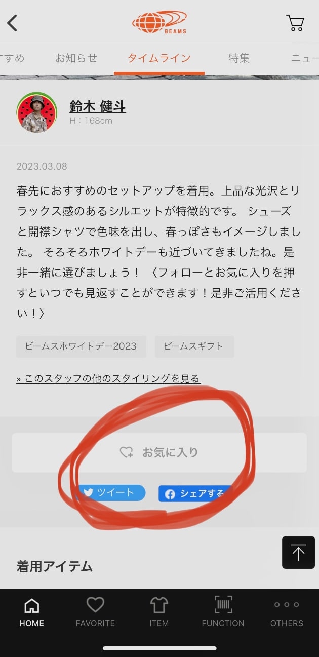 気になる商品や、ブログ、スタッフのスタイリングは、お気に入りを押すといつでも見返すことができます。