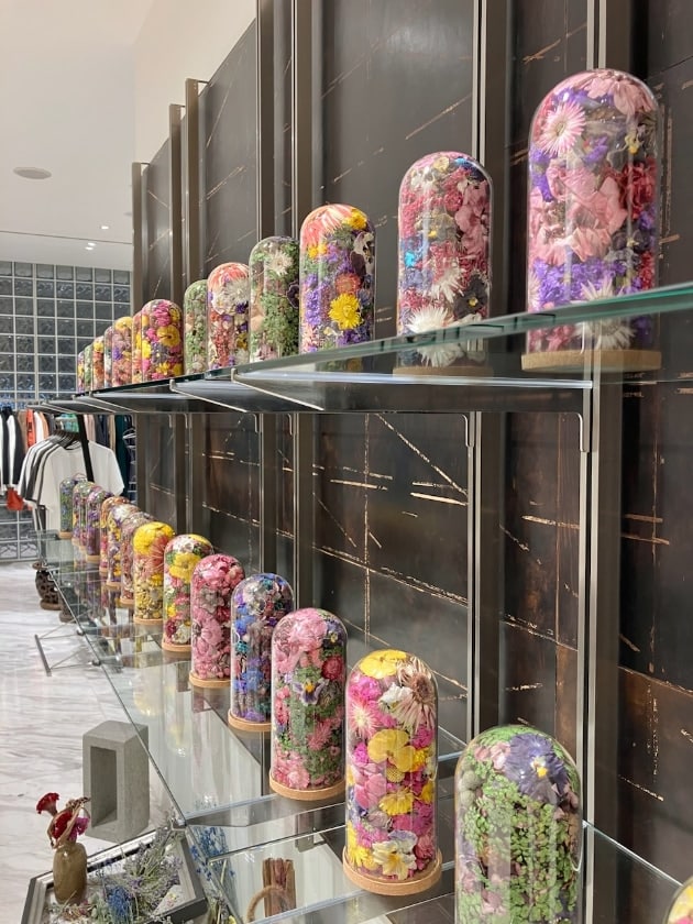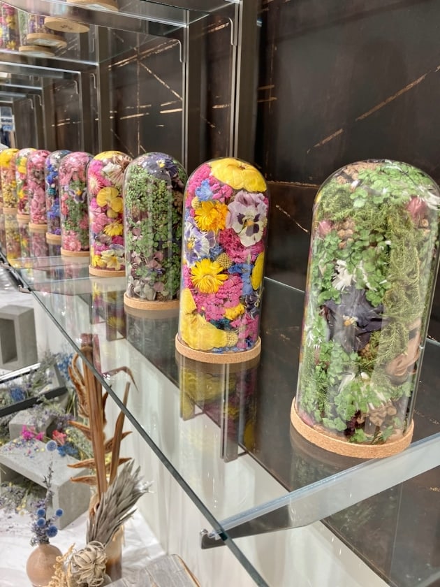 生花の風合いを残した状態で加工した物をガラスドームに詰め込んだドライフラワードームもご用意しております。