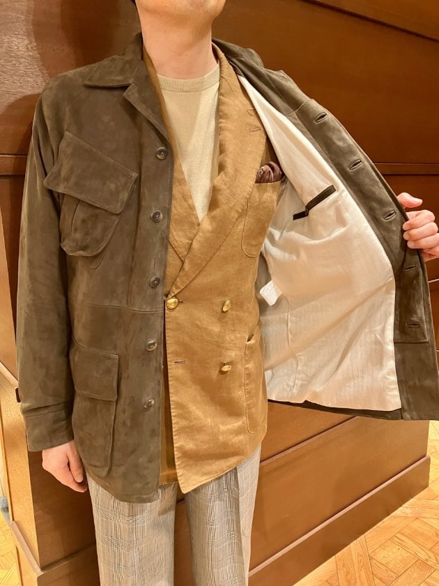 〈CINQUANTA〉思わず笑みが溢れる石田着用のスエードジャケットを。