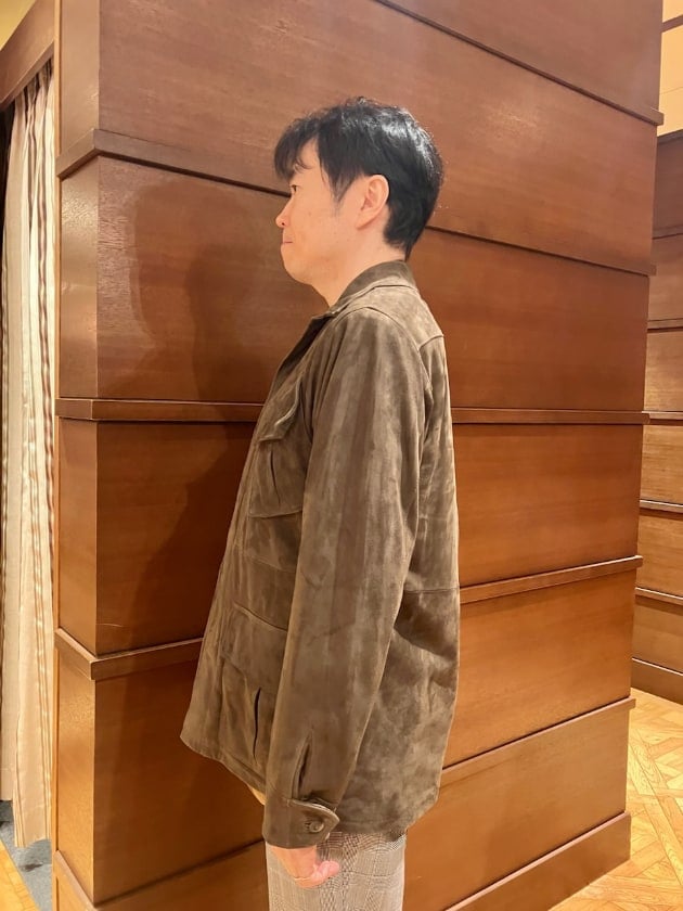 身長171cmのジャケットサイズのほとんどが44のスタッフ石田が、スエードファティーグジャケットのサイズ46を着用しております。
