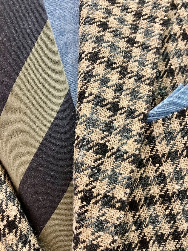 ツイード調の素材感とややスポーティーなテイストに合わせてシャンブレーのタブカラーシャツに、光沢を抑えた起毛感のあるストライプタイでまとめて。