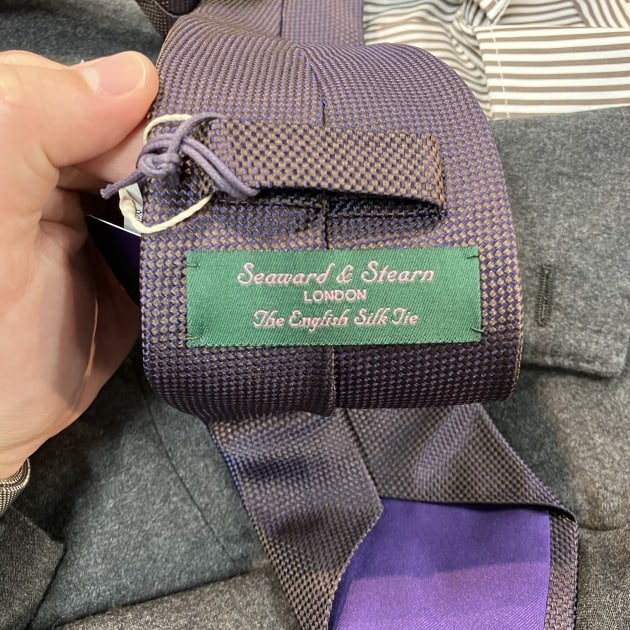 と、そんなオススメのスーツに合わせたのは昨年の冬に買い付けをしてまだ少量在庫が残っている<Maria Santangelo>のストライプシャツと華やかな玉虫織りが目を引く<Seaward & Stearn>のソリッドタイ。