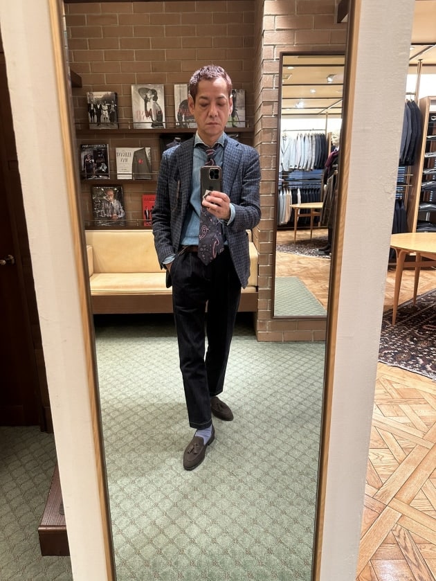 ネクタイを締めたジャケットスタイル。デニムシャツにデニムスラックスでシンプルに。グレー×ブルーのチェックジャケットにグレーベースのプリントタイを合わせてみました。ジャケットは前の<TAGLIATORE>のものになります。