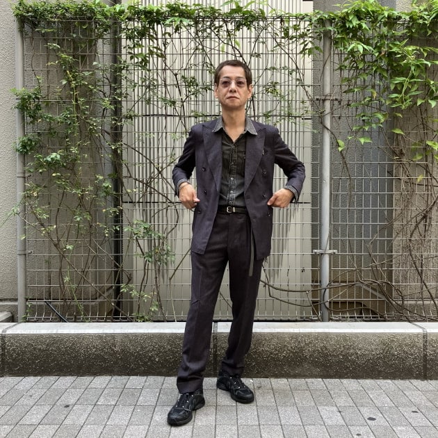 パープルの無地ライクなスーツにブラックウエスタンシャツ。パープルとブラックがメランジになっていて、無地っぽくみえる色のダブルスーツにブラックを効かせたコーディネート。<SALOMON>のスニーカーを合わせています。スーツは3〜4年程前にカスタムベーシック ビームスで仕立てました。