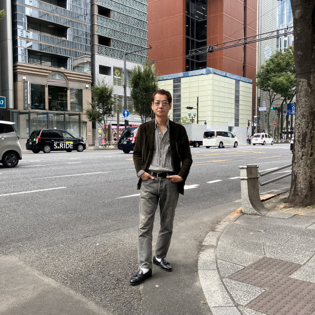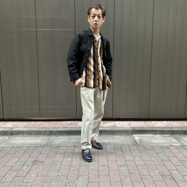 この日はオリーブグリーン色のコーディロイジャケットに黒と白の組み合わせ。ジャケットは<BEAMS F >イタリア製オリジナル。最近、白いソックスをよく履くようになりました。(ちょっと前までは履きませんでした〜)めずらしく、5ポケットのデニムです。最近はこういったデニムもほとんど履かなくなりましたー。