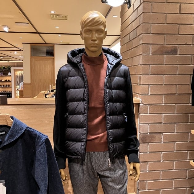 ニットとナイロンの切り替えが特徴的なダウンパーカー。単体での着用はもちろん、寒い冬にはコートなどのインナーとしてもお使いいただけるアイテムです。