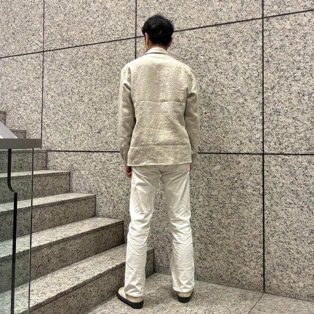 ウエストシェイプの無い、ゆとりのある身幅にコンパクトな着丈のモダンなバランスです。