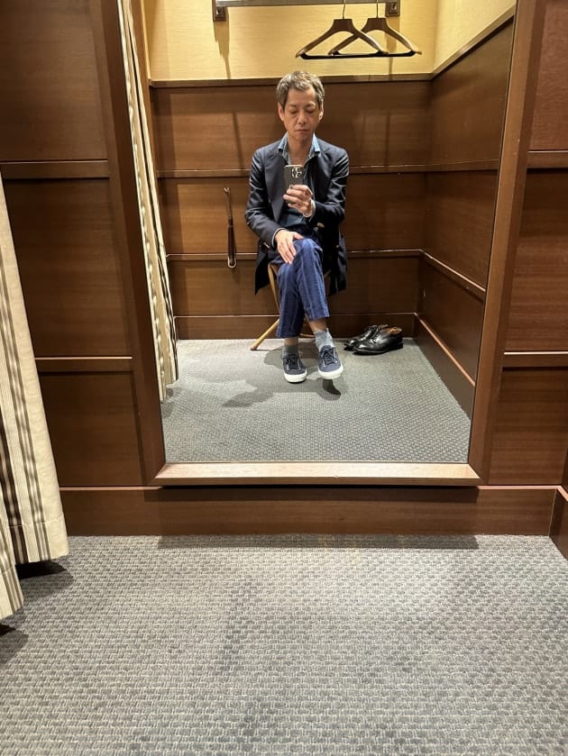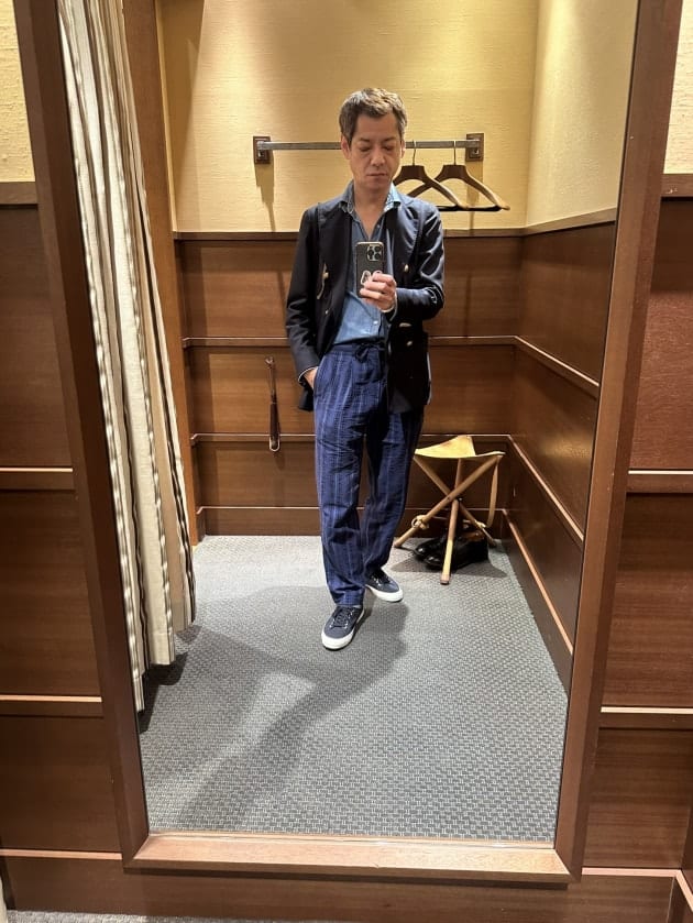 たしか昨年購入した<Brilla pel il gusto>オリジナルの商品。ダブルのブレザーにライトデニムのタブカラーシャツ、ネイビーのスニーカーで全体的にネイビー〜ブルートーンスタイルでした〜!