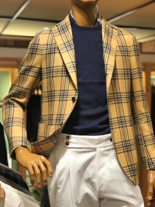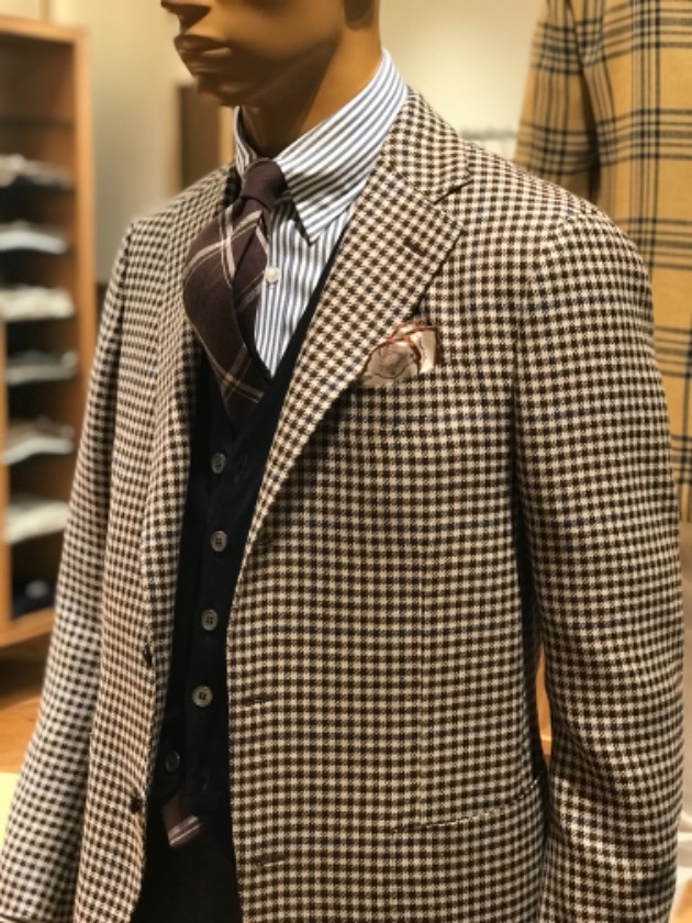 ネクタイもチェックを合わせていますが、ジレを入れる事で柄の見える範囲を調整している為、うるさい印象はないかと。