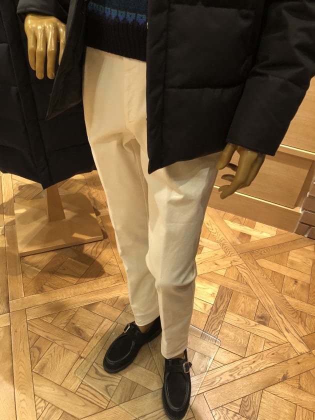 ホワイトパンツで秋冬のアイテムを使った着こなしもスッキリした印象となります。