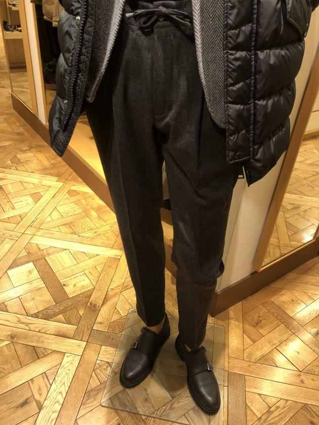 ニットを合わせたリラックススタイルにはドローコードパンツが相性抜群。足元はスニーカーでもOKですが、ここはカジュアルにも使いやすい<PARABOOT(パラブーツ)>で大人カジュアル仕様。