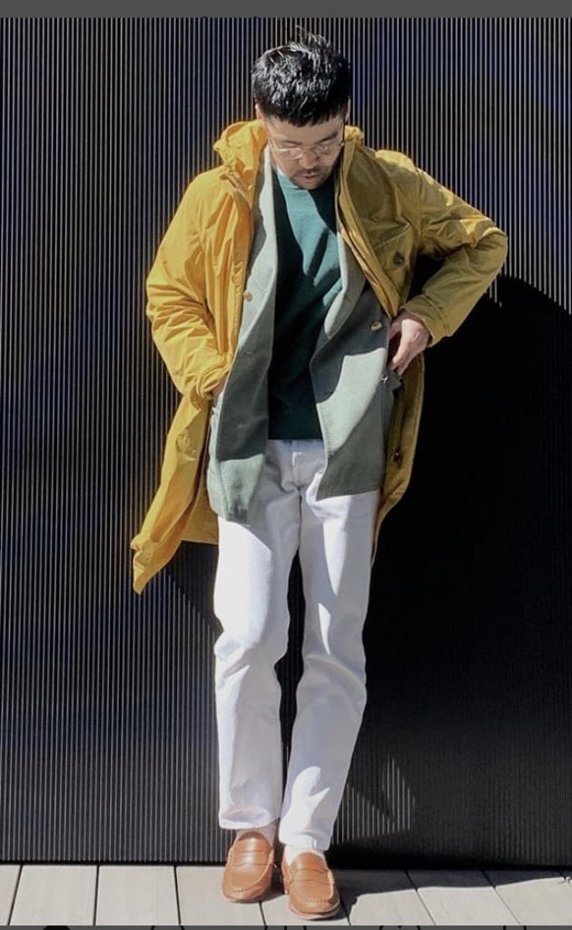 弊社敏腕プレスの安武が自身のInstagramで着用しておりました。グリーンのジャケットにこのイエローがよく映える。