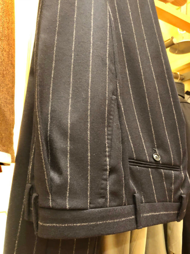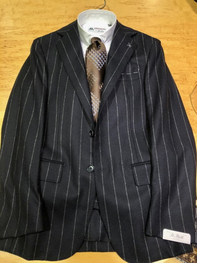ネイビー地に幅の広いチョークストライプがヴィンテージ感溢れる一品となります。