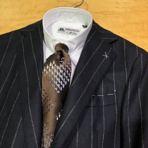 ヴィンテージ感のあるスーツには、ヴィンテージ調のネクタイがよく似合う。こんな雰囲気あるコーディネートの時はタブカラーの襟型で変化を付けたい。