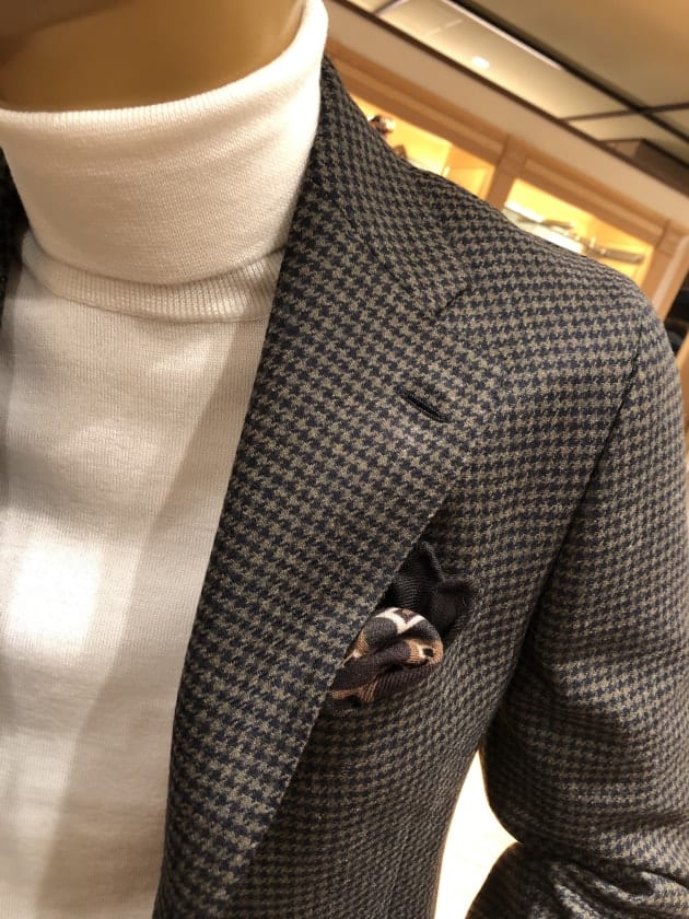 ニットだけだと少し寂しい印象だったので、ポケットチーフを入れて厚みを持たせて。
