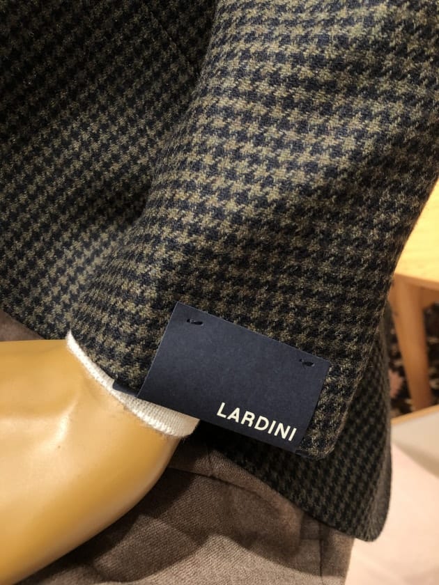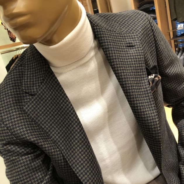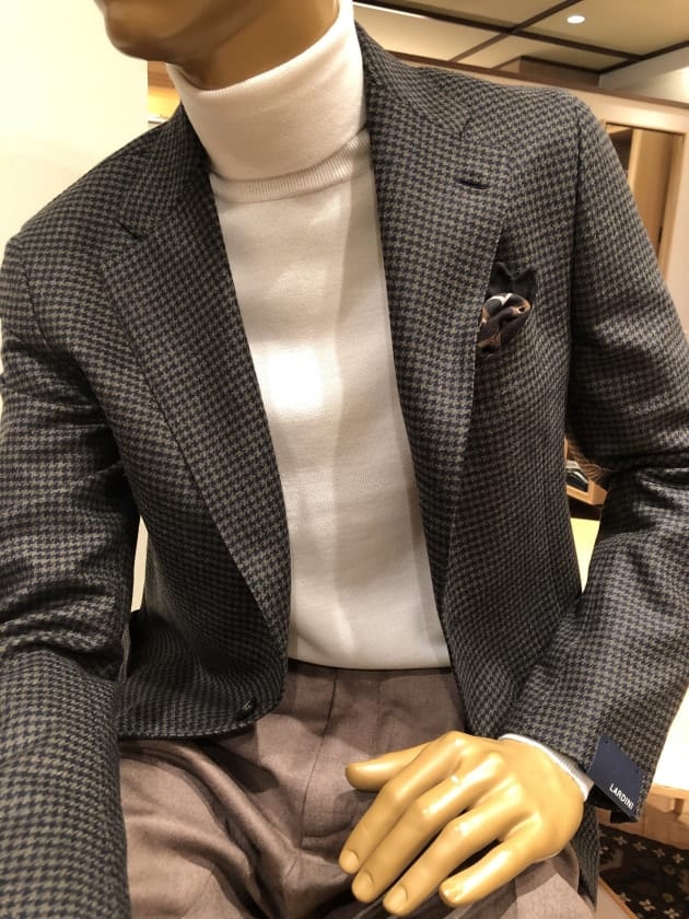 オリーブ色のハウンドトゥース柄が目をひく同ブランドの新作ジャケットを、